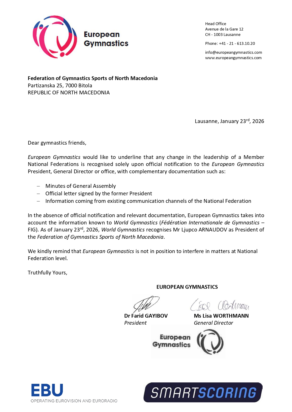 Европската гимнастика информира дека секоја промена во раководството на Национална гимнастичка федерација може да биде признаена исклучиво по официјално известување доставено до претседателот, генералниот директор или канцеларијата на Европската гимнастика.