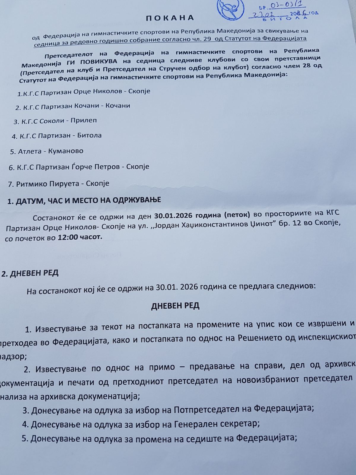 Федерацијата на гимнастички спортови на Северна Македонија (ФГСРМ), во интерес на транспарентноста, правната сигурност и заштитата на гимнастичкиот спорт, го дава следното појаснување во врска со легитимитетот на нејзините раководни органи, претседателството и дејствијата на поединци кои во јавноста се претставуваат како овластени лица.